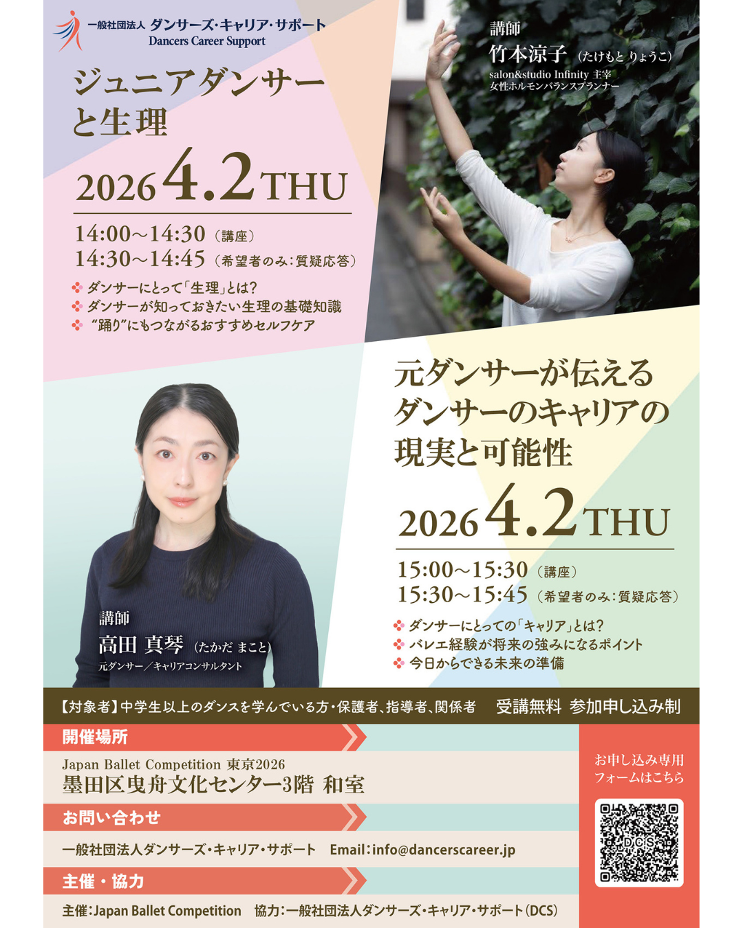 2026年年4月2日、ダンサーのための「身体」と「キャリア」をテーマにしたセミナーを実施しました。ジュニアダンサーおよび保護者・指導者を対象に、身体との向き合い方と将来のキャリアという、ダンサーにとって切り離すことのできない2つのテーマを扱いました。